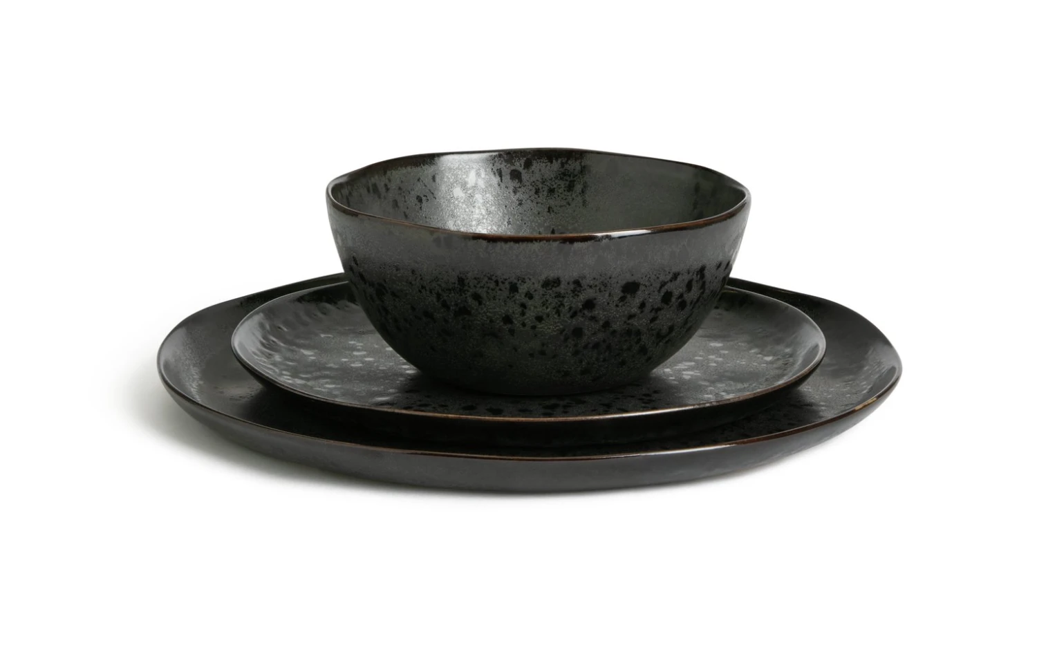 Dark and dramatic. Our stunning, black reactive glaze 12-piece dinner set is bold and beautiful. This stoneware collection includes 4 large plates, 4 side plates and 4 bowls, it's ideal for everyday use or more formal affairs. Designed to display food at its best and create a bit of drama at dinner parties. Naturally undulating edges and a matte glaze give this tactile set a hand-made feel. Microwave safe, so heat and take straight to the table. Then stack in the dishwasher and you're done. Delicious.