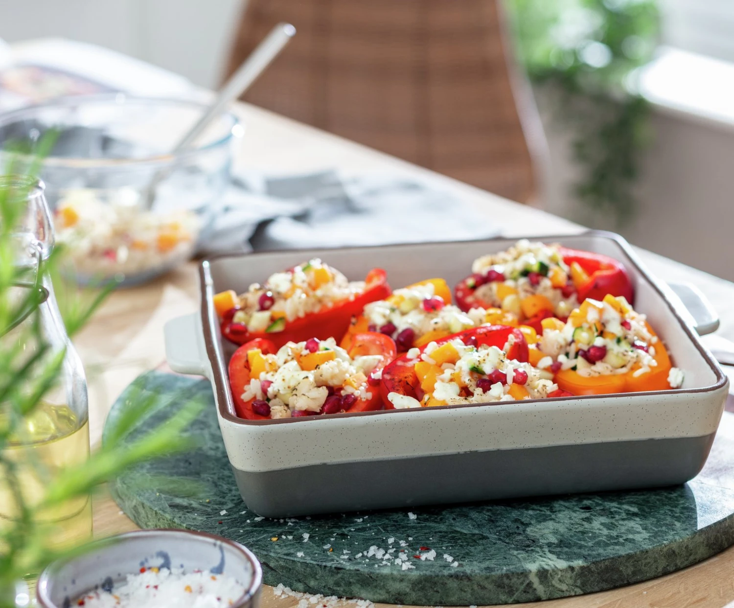 Picturing the perfect Sunday roast? This square ceramic roasting dish will help you produce some mouth-watering results. With a tone-tone design, rustic rim and smart speckle finish, it's a good-looking piece of cookware. And it's versatile. Handles make it easy take from oven or microwave straight to the table. It's even freezer proof, how useful is that. A dishy, dish.