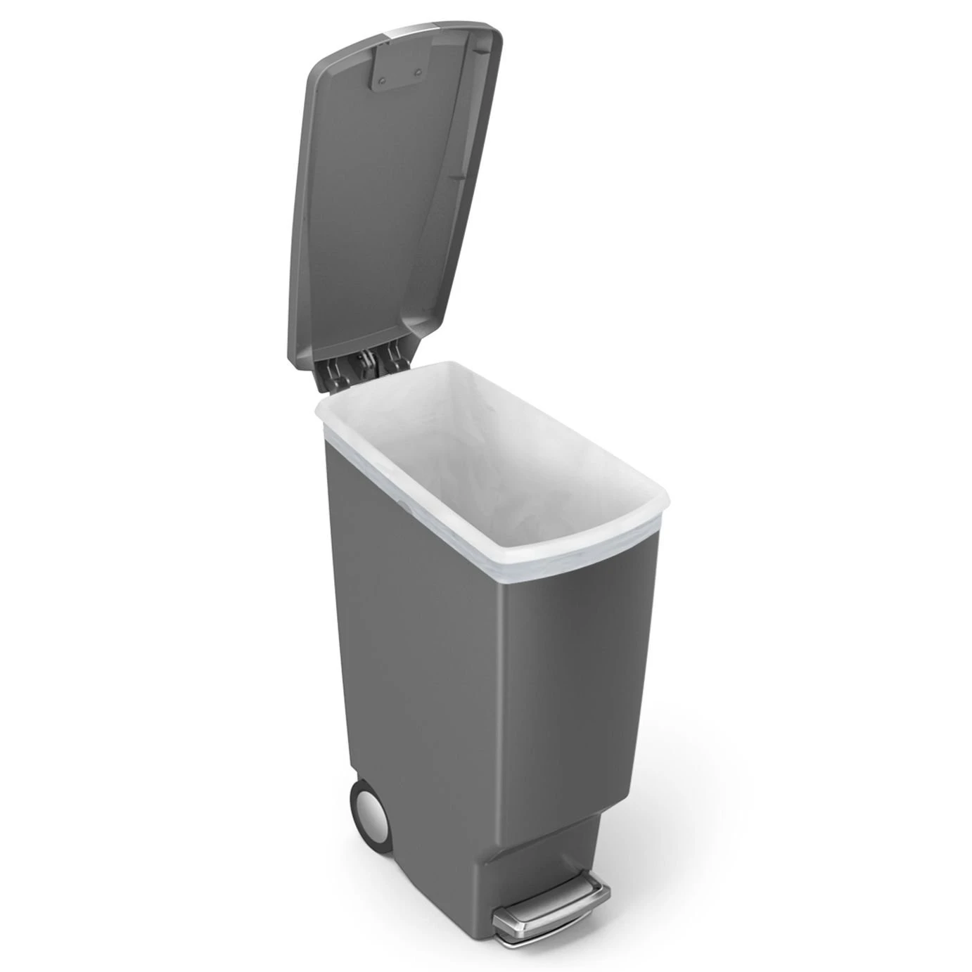 The simplehuman slim plastic pedal bin has a space-efficient shape that fits perfectly in tight spaces, like between cabinets. The strong steel pedal is designed to last, and our patented lid shox technology ensures a smooth, silent close every time. A slide lock helps keep rubbish in and pets and curious children out. Easy to move too with built-in wheels. simplehuman code K liners are designed to fit this bin perfectly, extra-thick plastic and double-seam construction prevent rips and tears.